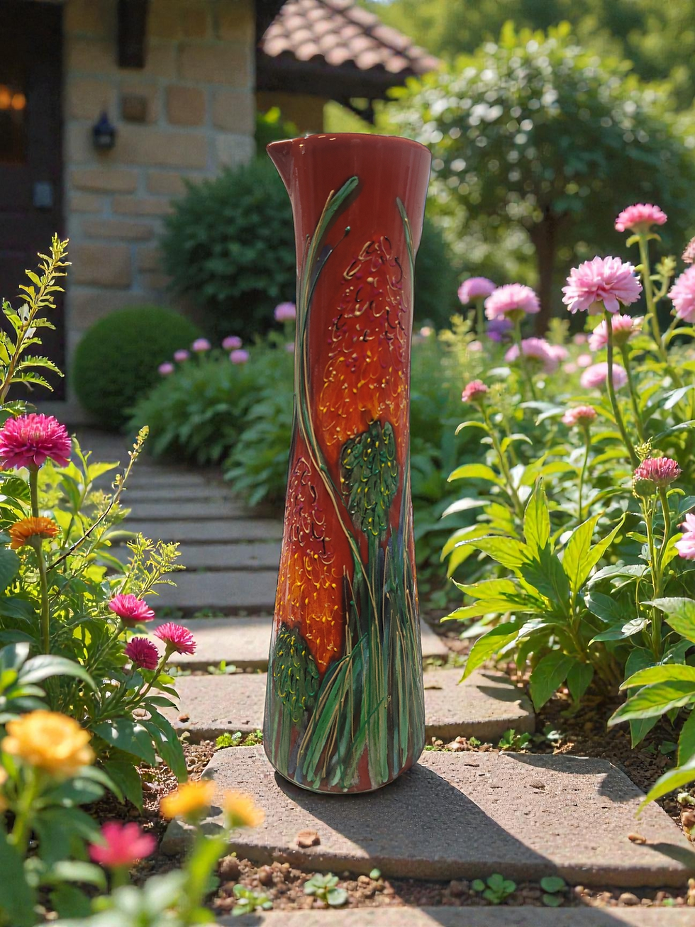 32cm lipped slender vase hand painted Red Hot Poker design